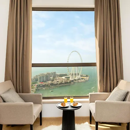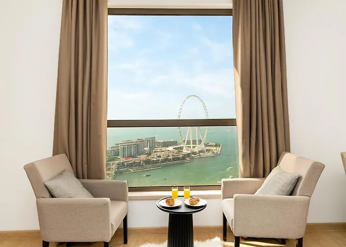 The spacious 118 m² Beachfront 2Br Dubai Eye & Sea View Beach Access apartment lies 2.5 km from the Jumeirah Lake Towers and a mere 10 minutes' stroll from Jumeirah Lake Towers tube station. At the apartment guests can lounge by a swimming pool or visit the JPR Beach, which is located only 0.6 km away.